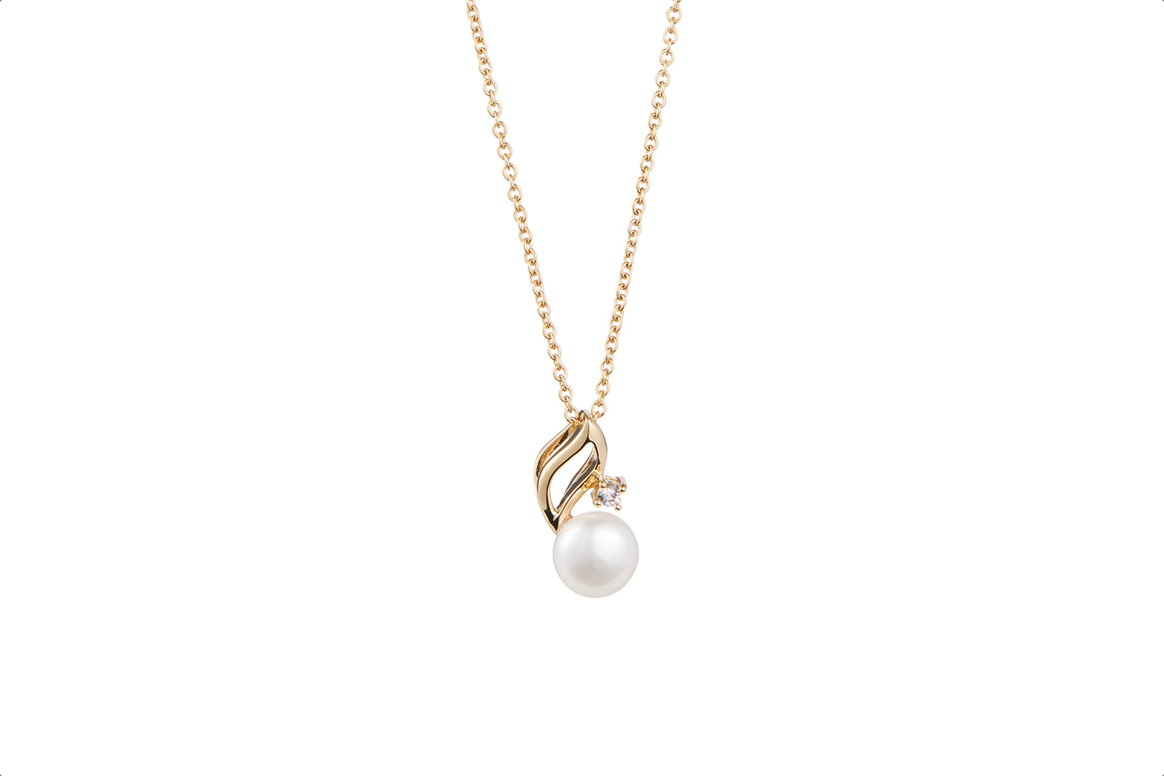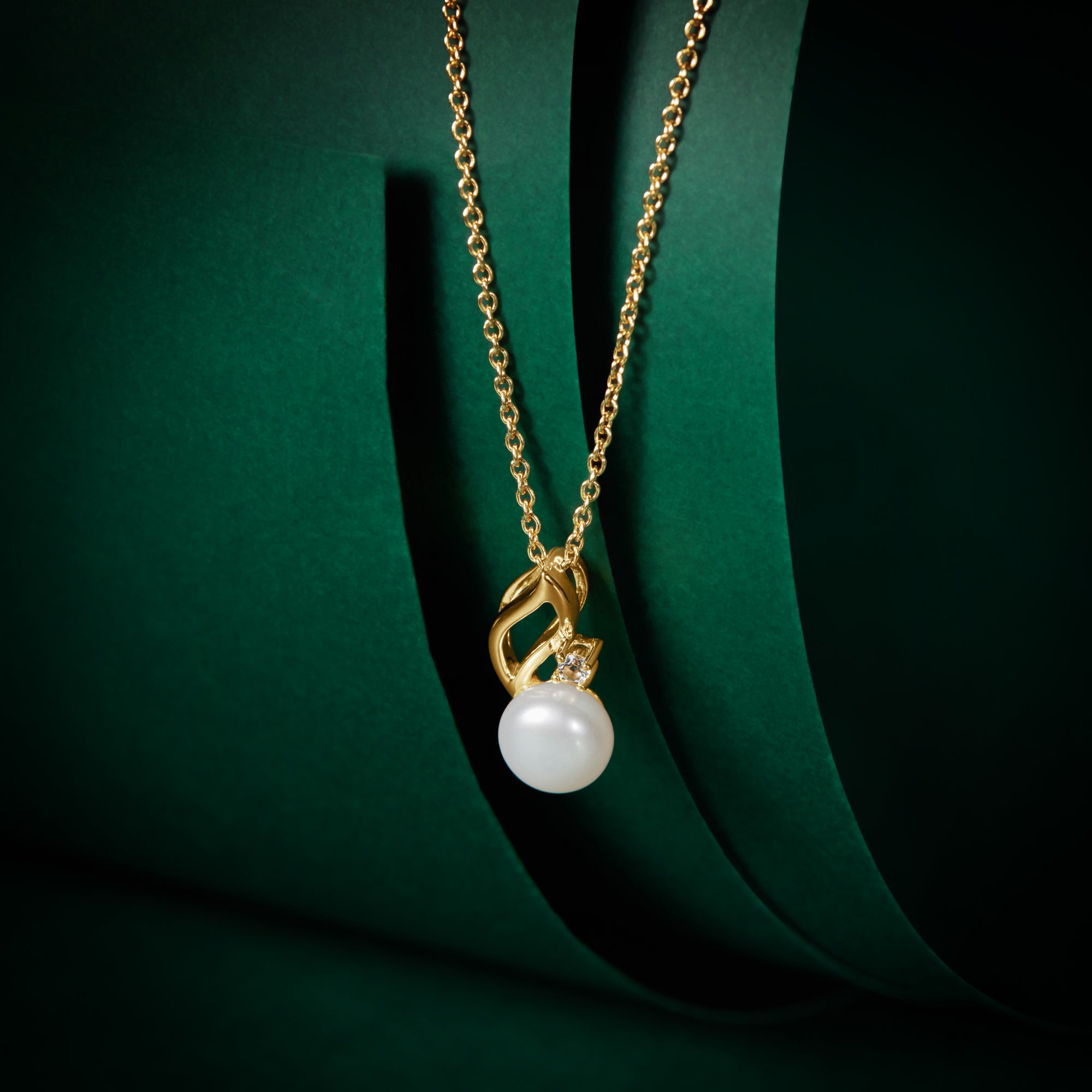 Delicate with a touch of drama, the Isla Pendant is a refined composition of soft curves and luminous accents. A radiant freshwater pearl hangs gracefully from a sculpted gold-toned leaf, accented with a twinkling white topaz that adds subtle brilliance. The organic shape brings a sense of movement and lightness, making it an ideal piece for everyday elegance or layering with fine chains.
